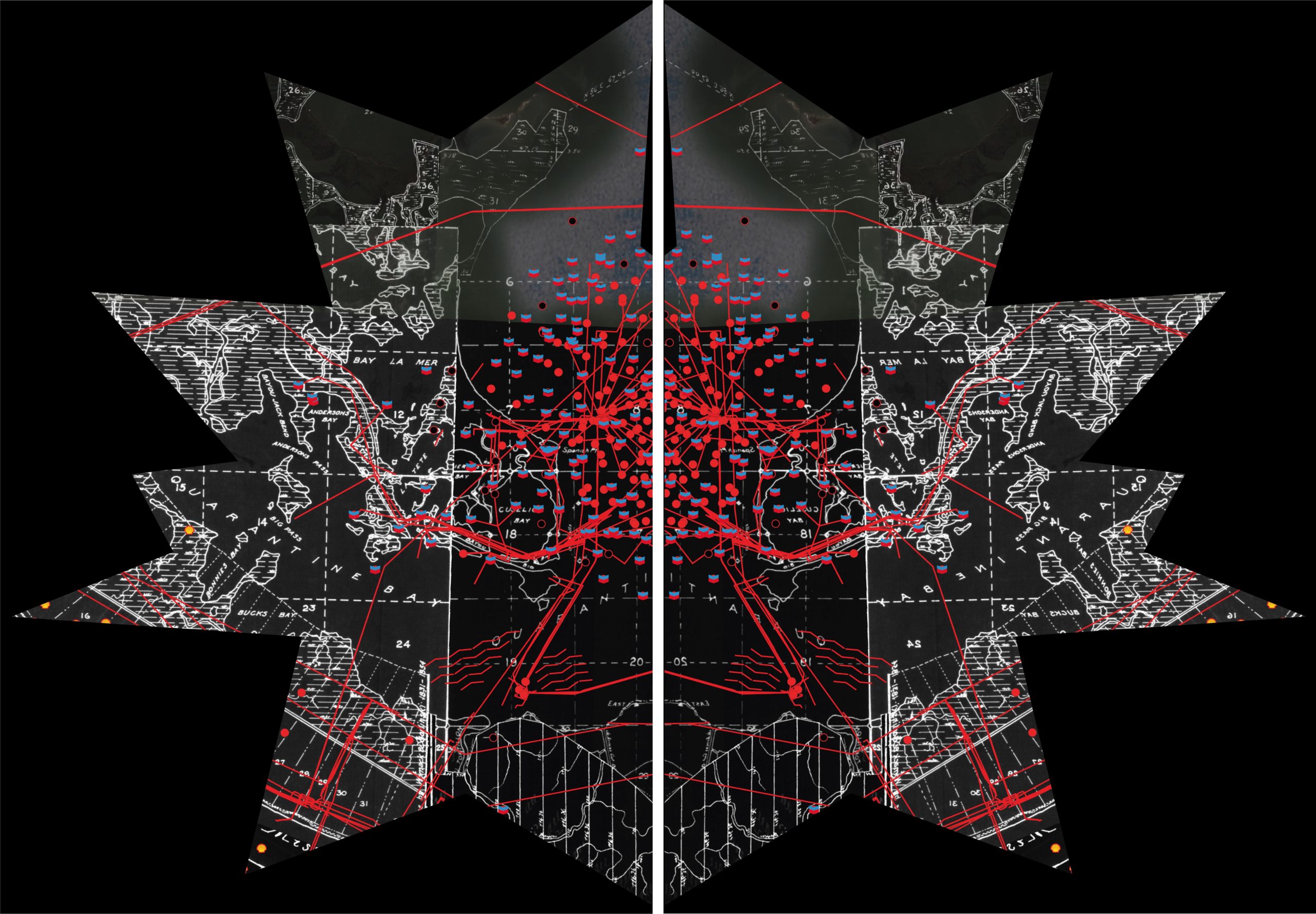 Imani Jacqueline Brown, Old Gods, 2021. Gràfic emmarcat i reflectit dels permisos per al desenvolupament costaner, amb pous de petroli i de gas inclosos, oleoductes i canals d’accés a Quarantine Bay, Plaquemines Parish, Louisiana (1920-2020), mapat amb els gràfics del Public Land Survey System (PLSS) d’abans de la guerra (1820-1860). El PLSS va ser el primer sistema nord-americà que va dividir el territori en parcel·les de propietat privada.