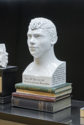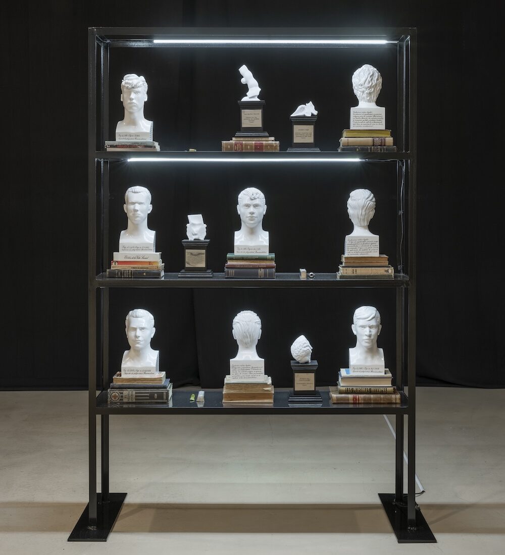 Daniel Gasol. Galería de anomalías patológicas, 2024 – 2025. Prestatgeria amb bustos ceràmics 3D i llibres.