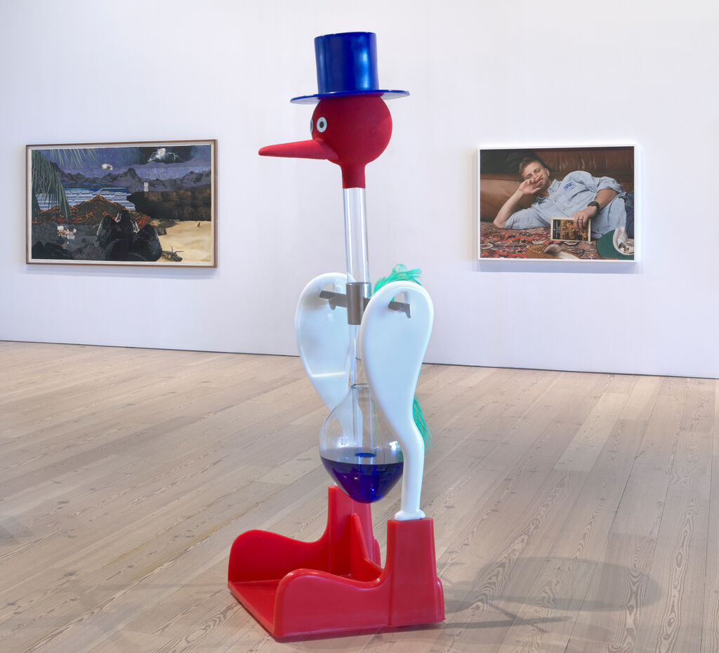 Hi ha a la Biennal més política que reivindicació, més autodeterminació artística (d’aquí la insistència en l’abstracció pictòrica de James Little, Dyani White Hawk o Rick Lowe) que no pas modèlica categorització en “grups” o “generacions”. La identitat nord-americana, element central en la història de la Biennal i del mateix museu, és aquí el referent explícit d’obres paròdiques: una des de dins (North American Buff Tit d’Eric Wesley), i una altra des de fora: Learning English from Becoming American de Rayanne Tabet. Mentre que l’ocell de la sort gegant dissenyat per Wesley desperta el riure còmplice, la videoinstal·lació de Tabet, que ridiculitza amb frases textuals l’examen de nacionalitat americana, cou. El procés d’assimilació obligatòria de la “cultura” nord-americana com a part del procés de “canvi d’estatus”, és ple de frases ridícules i grandiloqüents que, com a píndoles ideològiques, construeixen aquest nou jo (del migrant al naturalitzat) llest per ser explotat per el sistema. D’això mateix també tracta el “malson zombie” d’Andrew Roberts, l’artista més jove de la Biennal (1995), que a La horda mostra zombies que ens miren desafiadors des del seu món digital, amb pols d’Uber Eats, Disney o Amazon : l’especulatiu somni posthumà desperta la consciència de classe, i ressonen uns versos de Yoko Ono que bé podrien resumir el treball d’alguns artistes de la Biennal: Don’t be afraid to go to hell and back.