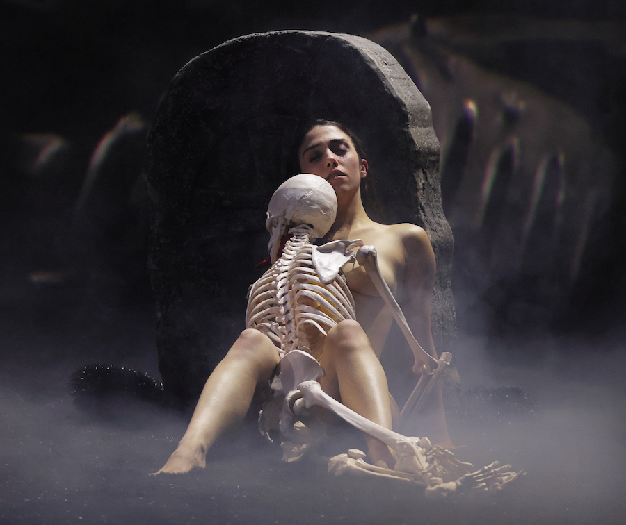 Marina Abramović, figura clau en la legitimació museística de la performance, a prop dels vuitanta anys retira aquí la seva pròpia anatomia per assumir l’ambigu rol de gran sacerdotessa. L’espectacle que ha concebut, dissenyat i dirigit condueix un cor de cossos anònims que encarnen mites i cultes ancestrals procedents de la mitologia balcànica —alguns datats entre els segles IX i X—, travessant geografies i cultures de Romania, Bulgària, Albània, Sèrbia, Bòsnia, Kosovo, Montenegro i Macedònia del Nord, fins a Grècia i Turquia, juntament amb tradicions gitanes i nòmades. La seva mirada evita la nostàlgia; és arqueològica, política i profundament tel·lúrica. El cos esdevé un arxiu viu, una superfície on s’inscriuen memòries esborrades per la guerra, la religió, el comunisme o la modernitat higienitzada.