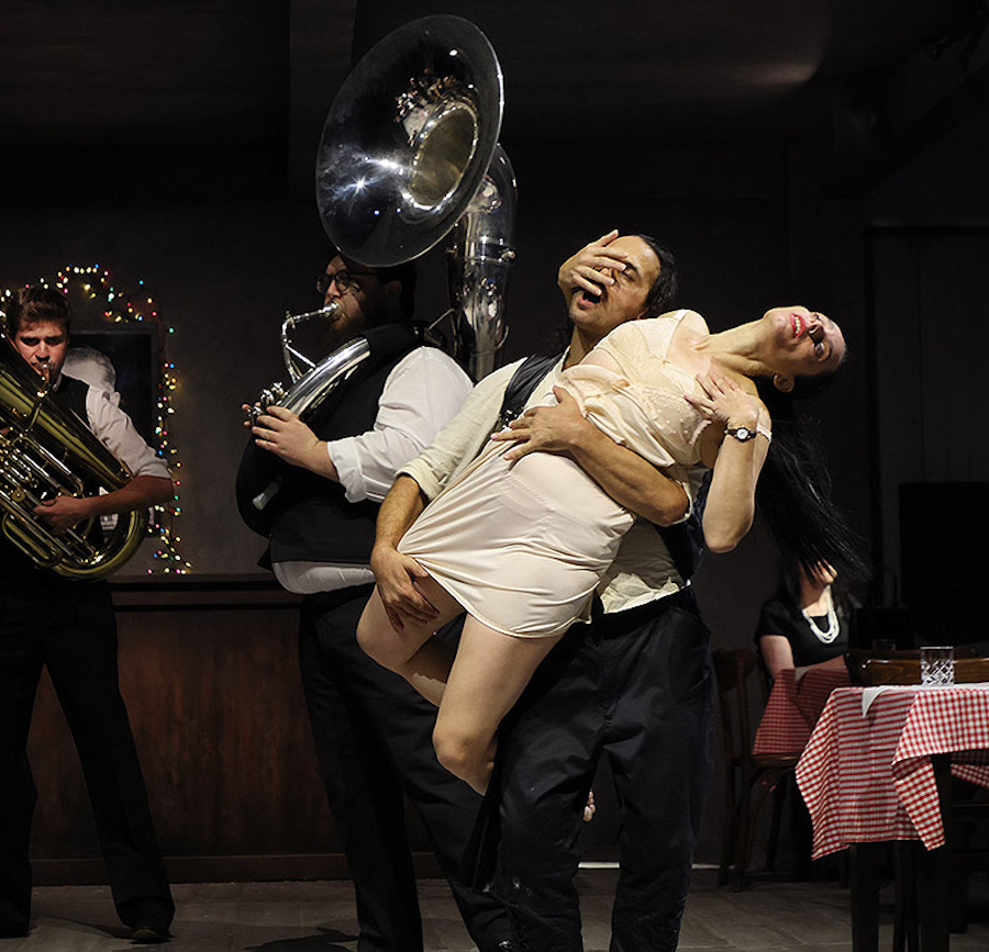 Estrenada primerament a Manchester amb setanta intèrprets activant simultàniament totes les escenes, la versió que arriba a Barcelona és una adaptació teatral condensada, amb trenta-quatre performers que encarnen onze escenes consecutives. Lluny d’afeblir la proposta, aquesta reducció n’intensifica la dimensió coreogràfica, desplaçant el focus de l’excés cap a una densitat corporal més concentrada i subratllant la idea de Gesamtkunstwerk: dramatúrgia i humor, dansa, performance, música folk balcànica en directe combinada amb electrònica, projeccions audiovisuals i animació s’entrellacen en una estructura fluida i immersiva.
