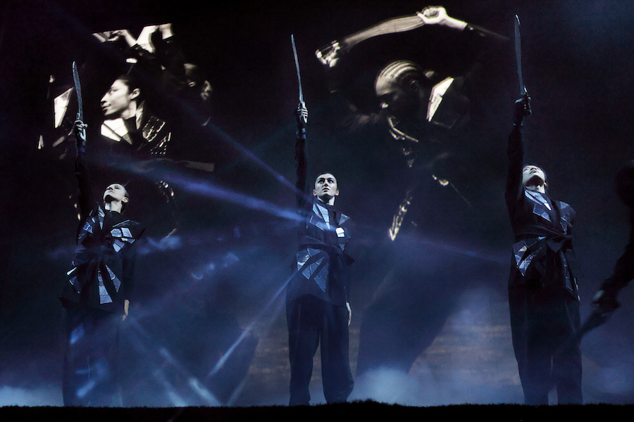 Visualment, el dispositiu reforça la dimensió ritual de l’obra. Una gran pantalla mòbil, que s’eleva i descendeix dividint l’escenari, projecta vídeos dirigits per Nabil Elderkin. Les imatges —de vegades a càmera lenta, d’altres en blanc i negre— introdueixen una temporalitat suspesa, gairebé hipnòtica, que dialoga amb la música i reprodueix els moviments en escena, creant una dualitat entre presència i reflex, acció i reverberació