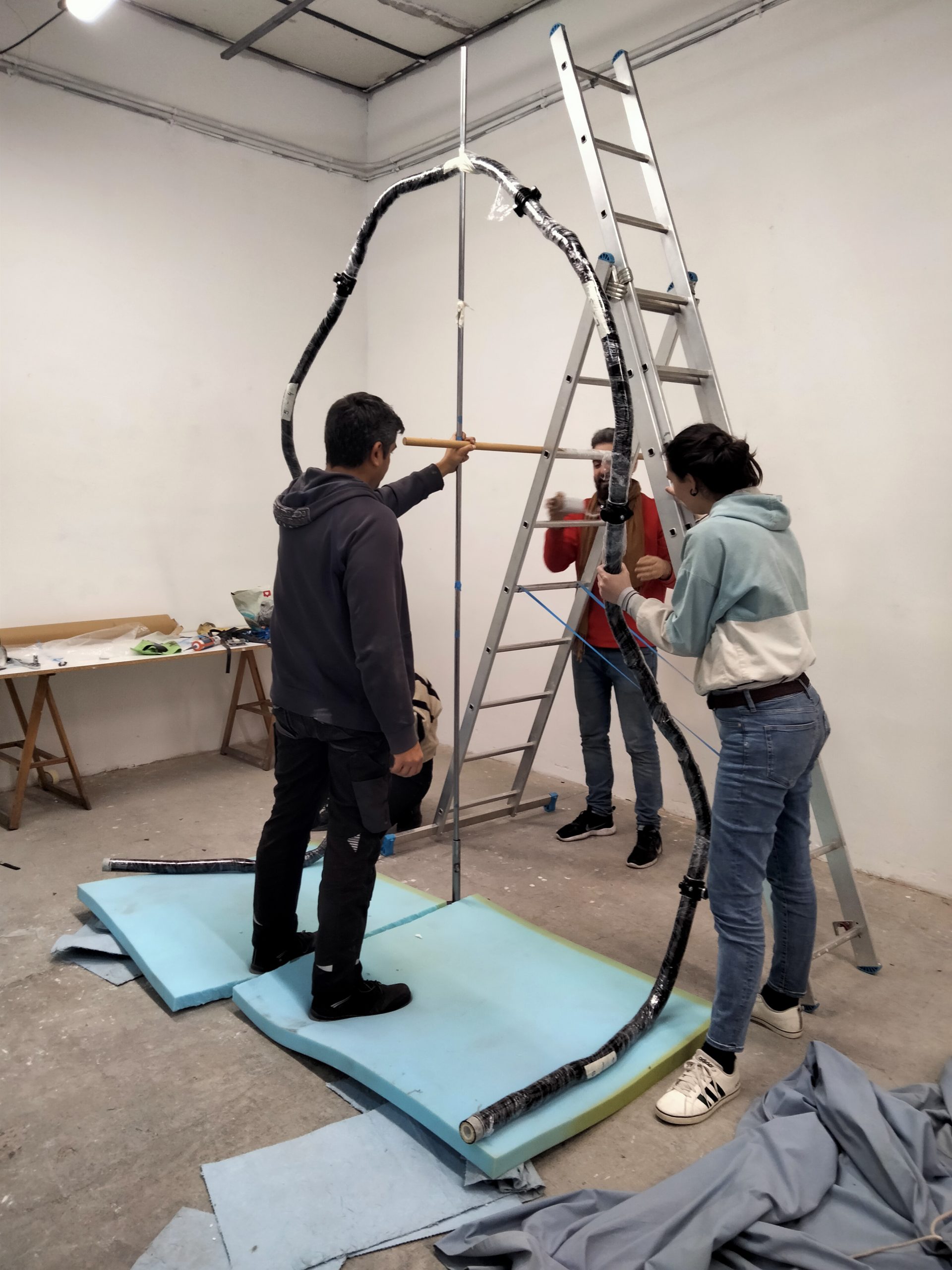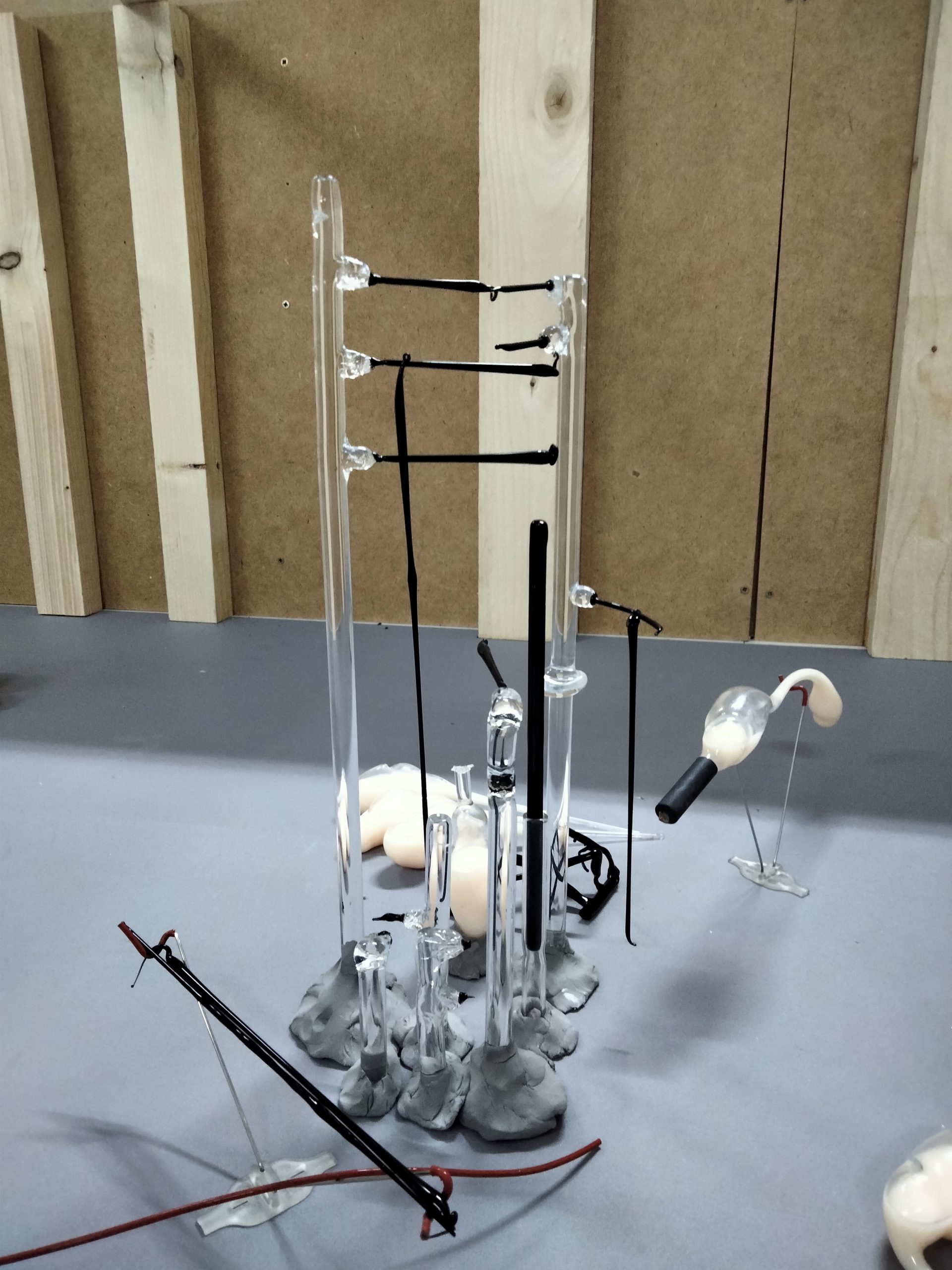 Al taller de la Lara Fluxà, a Fase, d’octubre a març hi fa fred, com a tots els tallers però hi havia caliu, com el foc alimentat d’oxigen per retòrcer el vidre. Era un caliu compartit amb en Paco Chanivet mentre es coïa una maqueta de 8 metres de peces petites que anaven agrupant-se de manera orgànica per crear famílies, parentius entre elles i pertinença total.