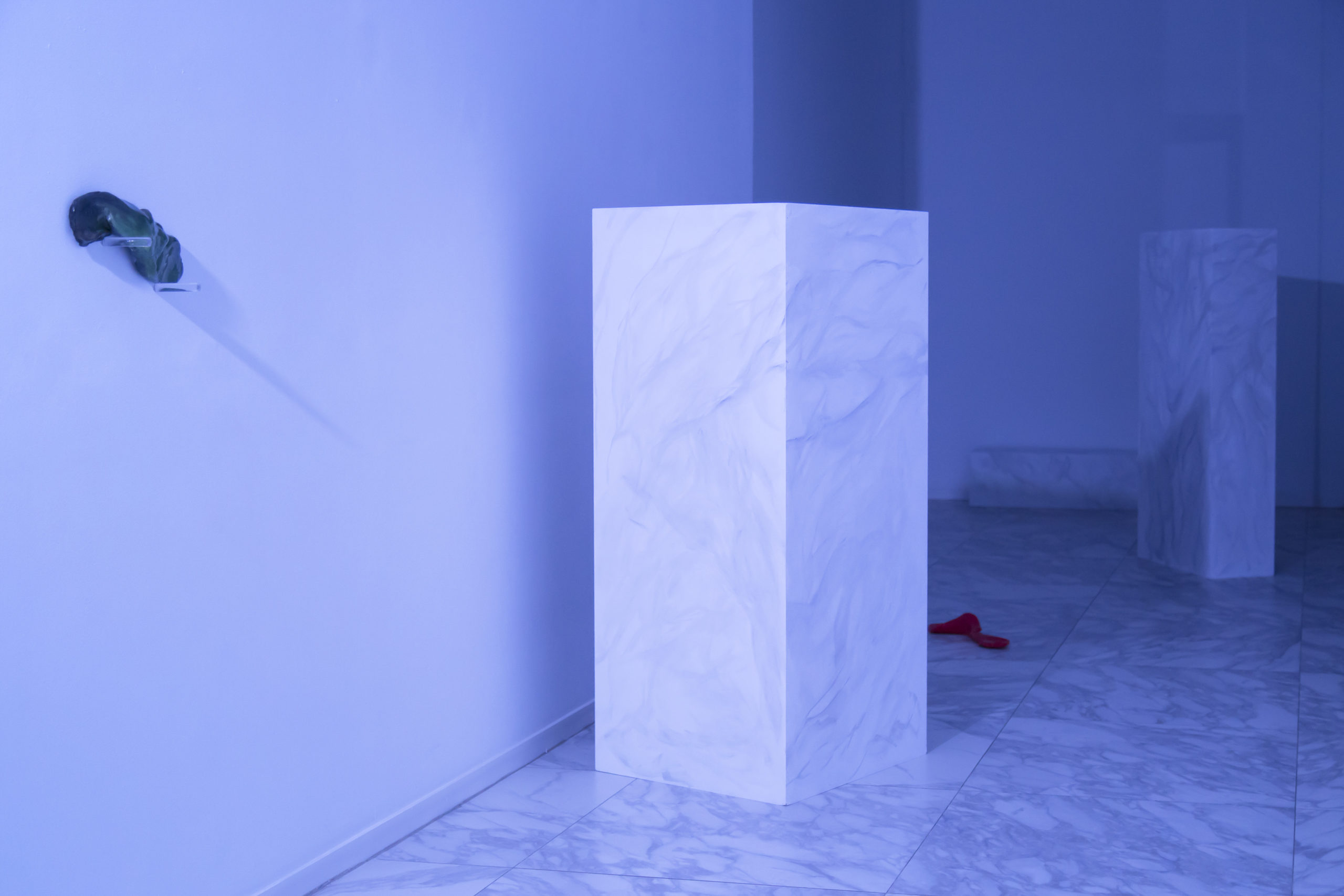 Seria desitjable que aquest parentiu canviés cap a un horitzó fonamentat en el mutualisme? De fet, aquesta tensió recorre la mostra i s’arriba a entreveure en algun instant. D’aquesta manera, ens trobem amb una il·luminació dissenyada per a interactuar amb els cortinatges de PVC disposats darrere la vitrina o l’aparador d’entrada, que intensifica i perverteix el caràcter del clàssic display window; així també respecte a la ubicació relativa dels elements de connexió successius, escala i ascensor; al fons de la sala se situen tres falses peanyes a manera de petits monòlits, que imiten el marbre, en continuïtat amb l’acabat del terra; al soterrani ens reben una sèrie d’estretes plataformes de tràmex sobre les quals podem –o no- caminar. Entre les cortines acríliques i el pla del terra, ignorant les peanyes vacants que colonitzen la paret, sota o al costat dels plans metàl·lics elevats s’escampen “les peces”, contradictòriament antropomorfitzades com a ugly enemies sota aquest títol comú: petites escultures orgàniques i informes de porcellana vidriada i impressions digitals sobre seda, entre d’altres. Aquesta esquemàtica dualitat interpretativa, arbitrària, entre els objectes escultòrics i les seves respectives posades en escena, evidencia la percepció enganyosa que les promou, juganera, la fabricació d’aparences fake, la transició entre gèneres i materials que es fa visible en els títols més encertats d’algunes de les instal·lacions, com Slimy Trampantojo (Enganyifa viscosa), Falso (Fals) o Lo Crudo y lo Cocido (Allò cru i allò cuit); la concreció física d’aquesta última referència a l’arxiconegut llibre de Lévi-Strauss encarna no ja la inesgotable dialèctica naturalesa i cultura, o fons i figura, sinó la pròpia de l’art i la seva exposició. El fràgil matís de la seva tramposa distinció.[2]Sobre el moment expositiu com a trampa veure: Esther Gatón, “Sunburns”, A*Desk, 28 de setembre del 2020.