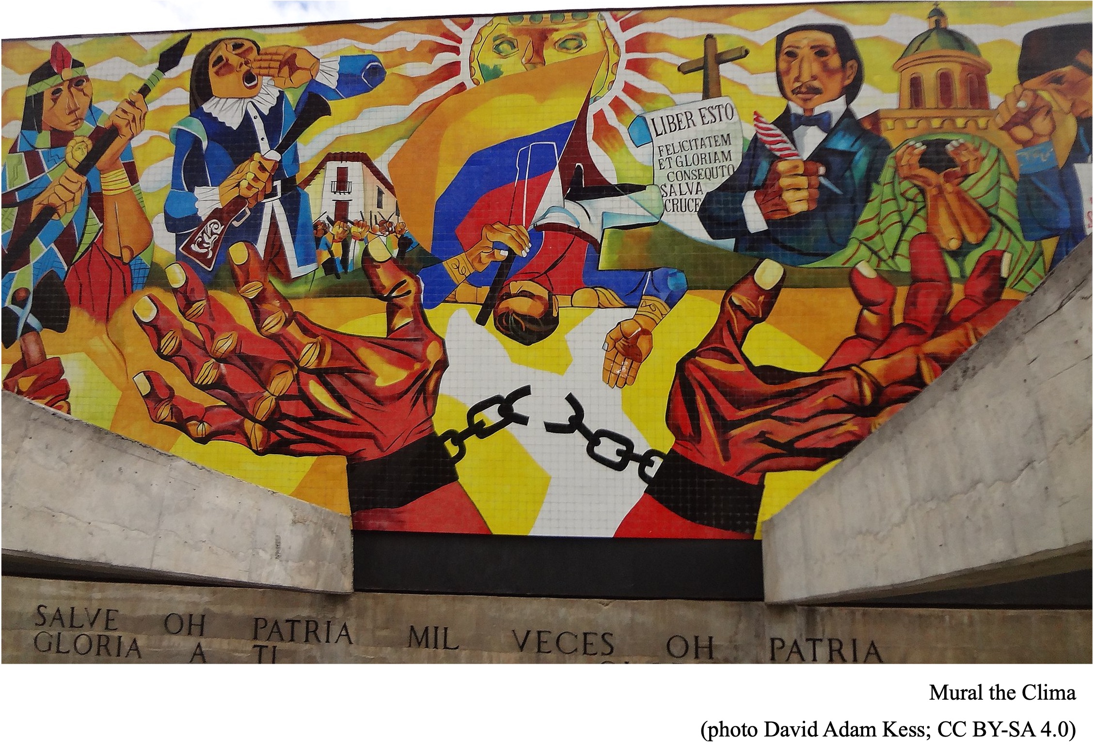 To the east of the Centro Histórico, barrio La Libertad climbs out of the valley, up the Andean slopes. Pastel pink, yellow, and blue houses line the hairpin curved road, thinning with each ascending topographic line. On one of the neighborhood’s high points, Cima de la Libertad, sits Museo Templo de la Patria, a museum commemorating a battle for independence from the Spanish Crown. On top of the museum’s building, a large vibrant mural depicts a pair of brown hands breaking free from their chains, in the background two chromatic indigenous men hold weapons while two dull mestizo men hold plume and paper. That the indigenous people working the feudal hacienda system were largely unaware of the formation of the independent Ecuadorian state or that the indigenous people who did fight in the “independence” battles were coerced and manipulated appears unimportant.