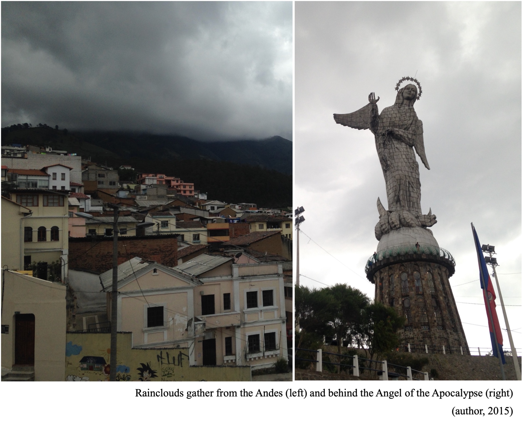 I couldn’t remember whether or not I was sad. We were sitting in a hill-top park with a view of the whole city center. The Centro Histórico contained many worlds, there were hostels, luxury hotels, spacious apartments for the emerging middle class, and subdivided flats where two or three migrant manual laborers shared a room with only one bathroom per floor. There were wooden-walled cafes with marble tables that served espresso and wooden-tabled restaurants with peeling wallpaper that served comida típica and only had instant coffee. Gringo tourists, latino tourists, Ecuadorian mestizos, and indigenous migrants all moved through the streets; the scales, speeds, and purposes of their lives coalescing and contradicting. These worlds, separate as they seemed, violently collapse in on each other, creating a chaotic imbroglio of indigenous, colonial, and neoliberal histories.