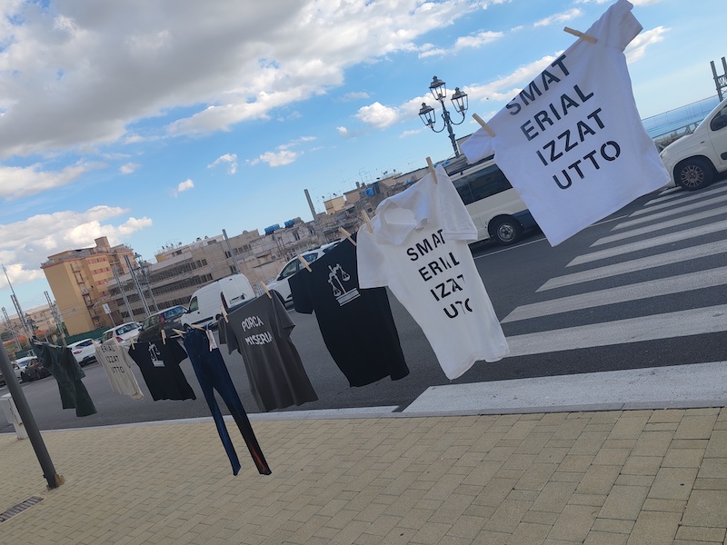 During the opening weekend, Alonso Gil carried out the 10-hour-long action Vestiti delle Vita / Clothes of Life in the square facing the inclusive social platform of the Scaro Caffe collective. There, he set up an open screen-printing workshop, inviting residents and visitors to bring their own garments to be printed with images and slogans that give visibility to citizens’ ideas, desires, and thoughts, while also supporting the situation of the migrant community in Agrigento. More than an art happening, it was a gesture of collective participation—a constant flow of hands, fabrics, and pigments that transformed the square into a space of daily encounter and resistance, where art merged with life in its simplest, most communal form.