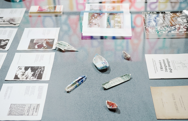 Display Cabinet: Conflicts & resistance. Left: Bertolt Brecht, ABC della GUERRA, 1975. Center: Nicolò Degiorgis,Mare Vostrum