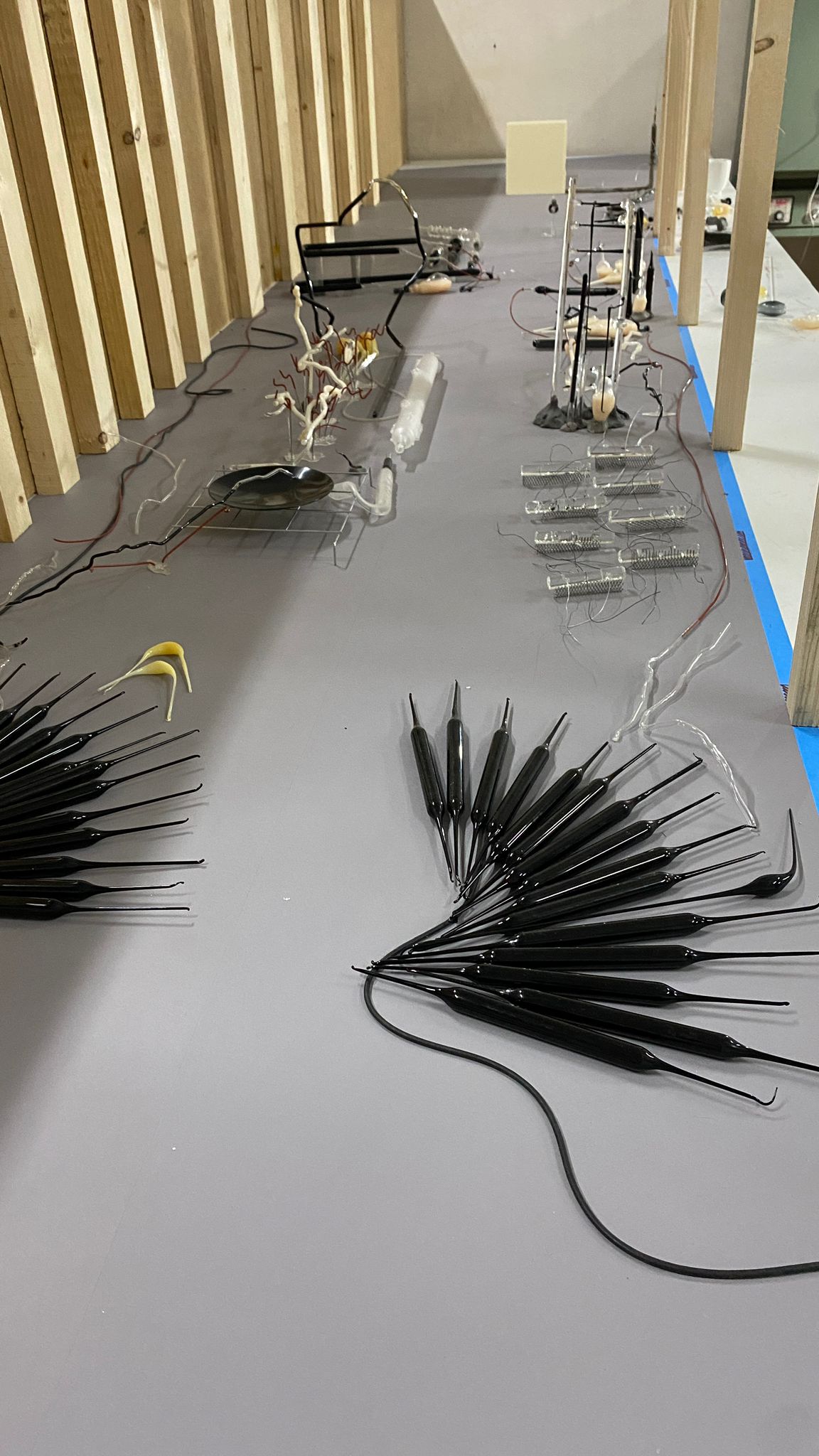 But more fire was needed because the pavilion is an elongated warehouse, brick with a wooden roof and above all large, very long, where it forced to think the gesture in another dimension, from caress to embrace and this was the challenge, the change of scale that not only consisted of the technical complication, resolved with the collaboration of Ferran Collado, master glassmaker, but also in the change of look, relocating from seeing the whole body to enter it and become part of it. Breaking an amniotic dermis by being part of this organ, going from a closed system to metabolism: an organism without limit where reactions occur in constant exchange, moving from body to landscape, an ecoton, a transition and transmutation zone of a material fecundity that rejects an ontological separation between body and vector, what Deleuze calls event-full-zone. Like slime, the encounter between water and earth. The intermediate state between solid and liquid, an eternal plasma state.