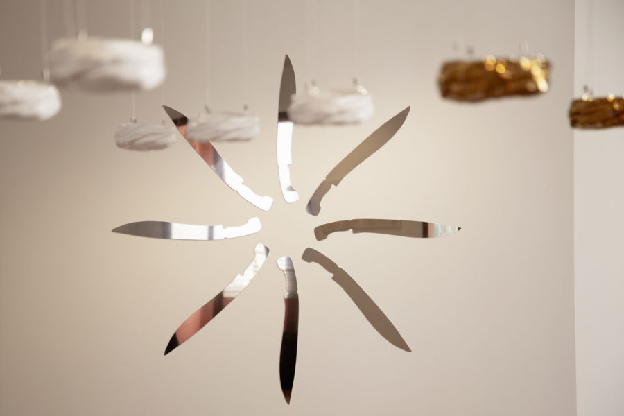Eight are also the number of blades or bolos represented in Steely Bloom, one for each of the women who Luna grew up with, but also the number of rays in the sun of the Filipino flag. The 8 rays represent the 8 provinces that revolted against Spain and one of them was Luna’s mother’s province, Batanga. Used primarily in farming, upon arrival of the Spaniards, the bolo became a revolutionary weapon that helped the locals to uprise against the colonial settlers. In the context of Luna’s work, these bolos become a metaphor of the battles fought in silence by women who give themselves to others. The steel mirror finishing invites the audiences to confront their colonial past and to interrogate the preconceptions they have on the Philippines and Filipino women.