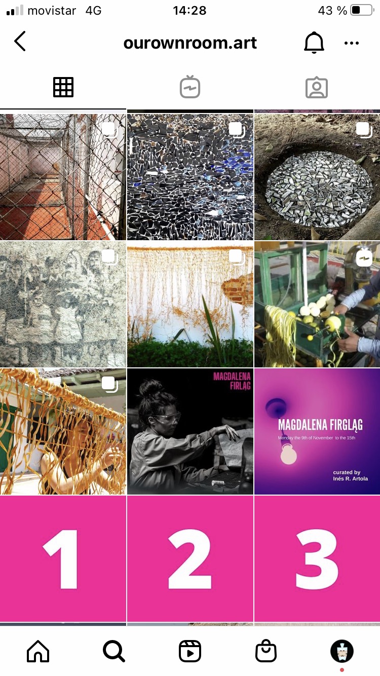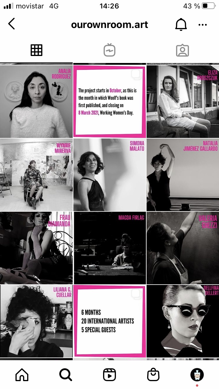 Ourownroom is a curatorial project by art historian Inés Ruíz Artola. The project began in October 2020 and is planned to end on March 8, 2021, coinciding with the celebration of International Women’s Day. A curatorial project in progress, where the twenty participating artists have been publishing their work on the social networks Facebook and Instagram; carried out under the premises determined in a continuous exchange and dialogue of conditions between the artists and the curator. In this way, Ourownroom is articulated over six months, during which each week, the account created with the same name in both networks, serves as its own room for each of the invited artists, who will deploy in that time a project carried out taking full advantage of the characteristics of the format. The idea is to end with the contributions of five writers, Florencia Abbate, Francisco Casas Silva, Belén García Abia, Margo Glantz and Kinga Stanczuk. All of them have wanted to participate by contributing from the literary field, precisely the one that gave rise to the project, thus closing the circle.