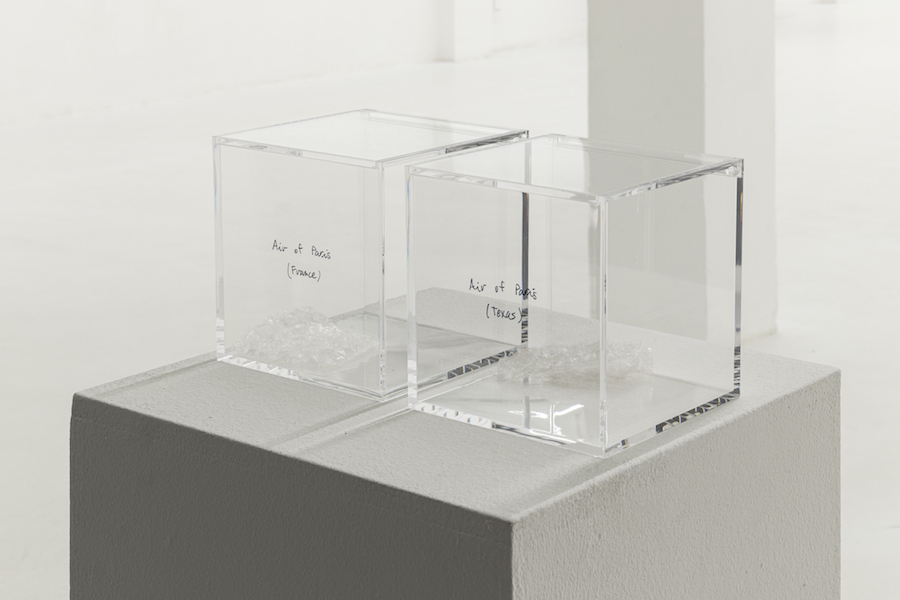 Pep Vidal’s answers are not articulated from a theoretical standpoint but rather from scientific methodology. The artist collects, measures, and compares. In this case, he does not draw any conclusions, but instead exhibits the evidence: exhaustive measurements of a glass vase made on the same dates as the one in which Duchamp prepared his ready-made and of a piece of amber from thousands of years ago. He classifies and arranges in methacrylate boxes samples of bubble-wrap from different countries, including bubble-wrap that protected different types of objects, different brands of perfume, and that contained different types of residues. He juxtaposes objects that weigh the same: a small piece of wood and a large roll of bubble wrap. He films clouds that know nothing about borders. He reminds us of the miles that photons must travel to transform into electrons and, in the end, into light.