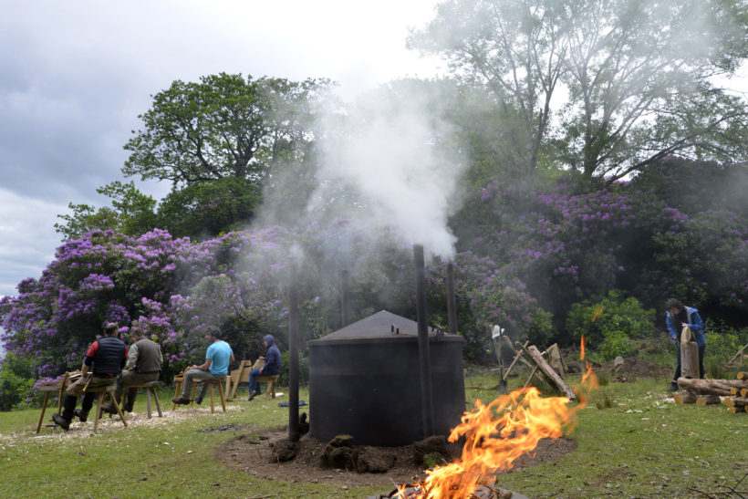 “Post Colony” fue un taller inmersivo de diez días en el que se usó como set de rodaje el Parque Nacional de Killarney, en el suroeste de Irlanda, que explora la naciente historia colonial e industrial de lo que luego se convirtió en un paisaje romántico y hoy turístico. Aquí, los voluntarios establecieron un campamento de carpintería ecológica en las profundidades del parque, para promulgar prácticas de taller y fabricación de carbón que se habrían utilizado en la temprana explotación industrial de los bosques irlandeses, a partir de finales del siglo XVI. En lugar de maderas duras nativas, se utilizó la especie invasora Rhododendron ponticum -que tiene raíces ibéricas e, irónicamente, se encuentra en peligro de extinción con el cambio climático-. Un carpintero de quinta generación fue el mentor de este proceso mientras yo lo grababa, haciéndome pasar por una especie de antropólogo visual.