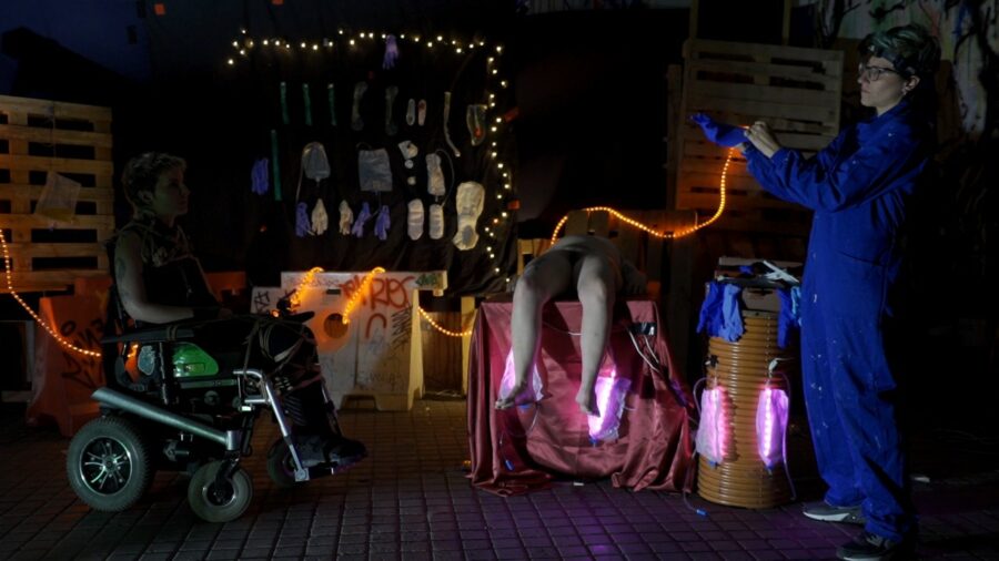 Elena: Uy, uy, que tengo un déjà vu. Este formato me está recordando a la entrevista que me hiciste para tu tesis doctoral [3]García-Santesmases Fernández, A. (2017). Cuerpos (im)pertinentes: Un análisis queer-crip de las posibilidades de subversión desde la diversidad funcional [Tesis Doctoral, Universitat de … Continue reading(risas). La perfo surgió a raíz de las Jornadas Cojas, Transfeministas y otras Rarezas [4]https://www.laneomudejar.com/jornadas-cojas-transfeministas-y-otras-rarezas/ en que nos encontramos con activistas queer y comenzamos a pensar juntas. Concretamente, quisimos juntar mi miedo a hablar de la incontinencia, qué suponía para mí eso, con el hecho de que, al final, yo no podía ir a los sitios de ocio porque necesitaba una asistente que me sondara. Y, como en la perfo yo no me quería sondar en directo, hicimos un intercambio de roles en el cual sondaban a mi pareja, mi asistente seguía siendo quien sondaba, y yo era la parte textual.