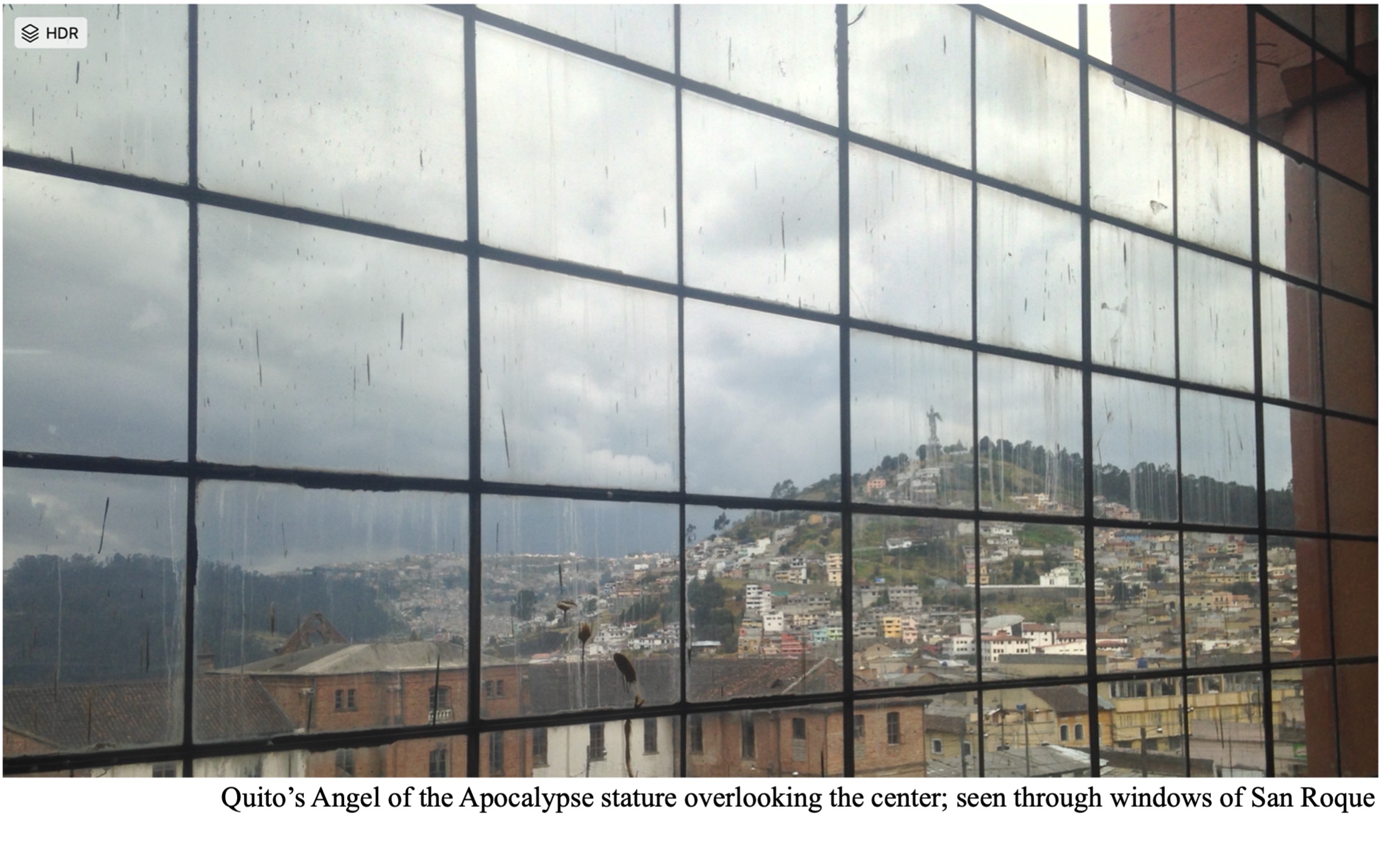 No podía recordar si estaba triste o no . Estábamos sentados en un parque en lo alto de una colina con vistas al centro de la ciudad. El Centro Histórico contenía muchos mundos, había hostales, hoteles de lujo, amplios apartamentos para la clase media emergente y pisos subdivididos donde dos o tres obreros inmigrantes compartían una habitación con un solo baño por piso. Había cafés con paredes de madera y mesas de mármol que servían café expreso y restaurantes con paredes de madera y papel pintado que servían comida típica y sólo tenían café instantáneo. Turistas gringos, turistas latinos, mestizos ecuatorianos y migrantes indígenas se movían por las mismas calles.Las escalas, las velocidades y los propósitos de sus vidas se mezclaban y contradecían. Estos mundos que parecen tan separados, colapsan violentamente unos sobre otros, creando un un embrollo caótico de historias indígenas, coloniales y neoliberales.
