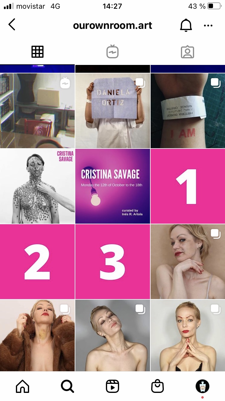 Ourownroom es un proyecto curatorial de la historiadora de arte Inés Ruíz Artola. El proyecto se inició en octubre de 2020 y está planificado que termine el 8 de marzo de 2021, coincidiendo con la celebración del Día Internacional de la Mujer. Un proyecto comisarial en progreso, donde las veinte artistas participantes han ido publicando su trabajo en las redes sociales Facebook e Instagram; realizado bajo las premisas determinadas en un continuo intercambio y diálogo de las condiciones entre las artistas y la comisaria. De este modo, Ourownroom se articula a lo largo de seis meses, durante los cuales cada semana, la cuenta creada con el mismo nombre en ambas redes, sirve de cuarto propio a cada una de las artistas invitadas, que desplegarán en ese tiempo un proyecto realizado aprovechando al máximo las características del formato. La idea es finalizar con las aportaciones de cinco escritoras, Florencia Abbate, Francisco Casas Silva, Belén García Abia, Margo Glantz y Kinga Stanczuk. Todas han querido participar aportando desde el ámbito literario, precisamente el que dio origen al proyecto, permitiendo así cerrar el círculo.