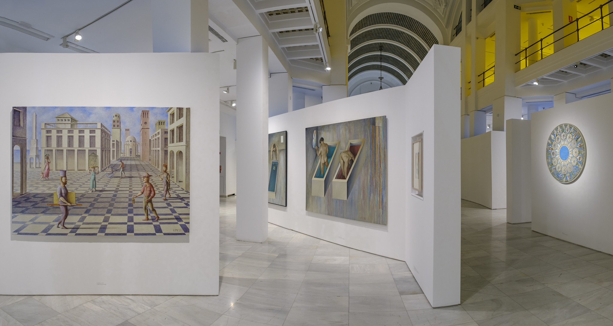 Desde el primer piso de la sala de arte Alcalá 31, uno puede configurar una imagen del laberinto, conceptual y espacial, que presenta el comisario Óscar Alonso Molina con motivo de la retrospectiva dedicada al pintor gaditano Guillermo Pérez Villalta. La arquitectura museística reproduce la intensidad psicótica de los cuadros, y recorriendo la exposición nos topamos con ventanas —reales y pintadas—, con faros —alzados y representados—, e incluso con muros que nos impiden el paso. Pero hay una diferencia esencial entre la idea común de laberinto y el laberinto expositivo: en este caso, todos los caminos llevan a algún lugar figurado. En cada esquina, en cada recoveco, hay un cuadro. Si por algún casual el visitante se pierde, puede siempre mirar al ábside de la sala, donde encontrará el rostro de Cristo, brújula y guía del visitante, del artista, de la historia del arte.