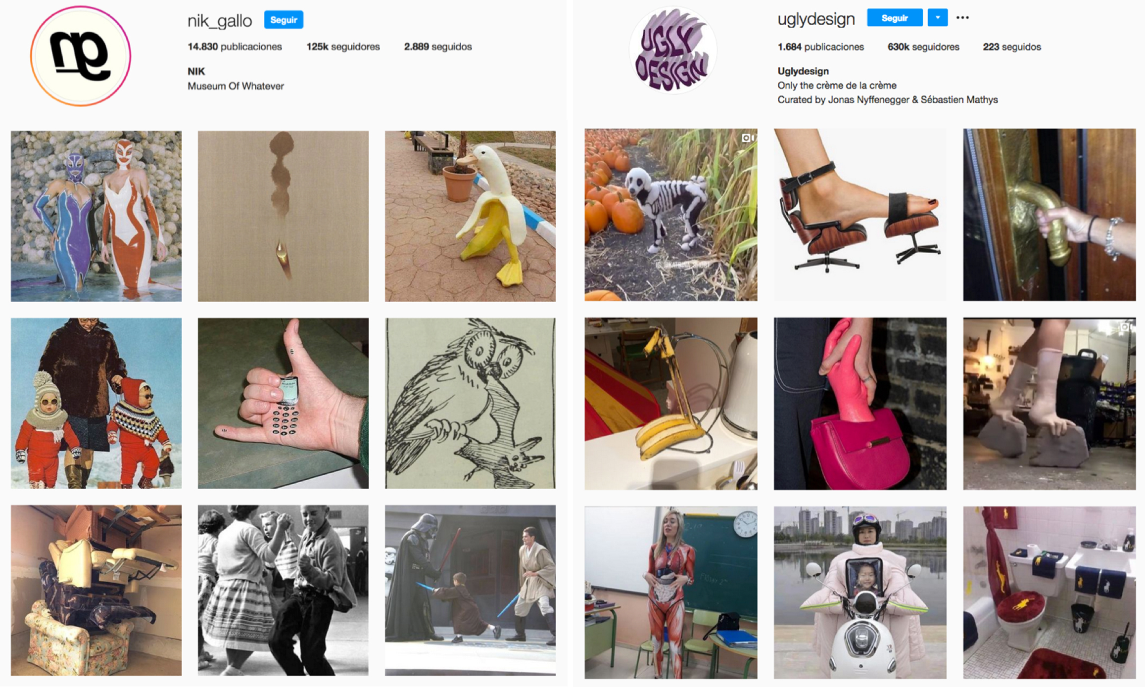 Bajo esta etiqueta de kitsch se reconocen dos tipos de usuarias de Instagram: curadoras y productoras. Las primeras se entienden como usuarias que configuran galerías de elementos visuales a partir de imágenes de particulares. Curadoras de pinacotecas de ready-mades virtuales, que identifican el denominador estético común y estos se convierten en arquetipos de la (anti)estética más espontánea de las redes. Bajo las consignas de «Museum of Whatever» o «Only the crème de la crème», los perfiles de @nik_gallo y @uglydesign [Fig. 1] ya anticipan un talante sarcástico y bromista que será absorbido por las usuarias productoras. Son las autoras conscientes de las imágenes-basura, que han nutrido su gusto estético en el kitsch más virtual y una vez descubiertas por los perfiles curadores, pasan a formar parte del circuito artístico de lo cutre. Ambas usuarias comparten unos preceptos estéticos y abordan sus producciones desde la ironía. Por ejemplo, @brnjn_ opta por etiquetar su perfil como página de «alquiler de coches exóticos», aunque no encontramos ningún coche en su perfil, ni voluntad de incluir alguno. Es esta la ironía que establece el contrasentido como piedra angular de un nuevo paradigma.
