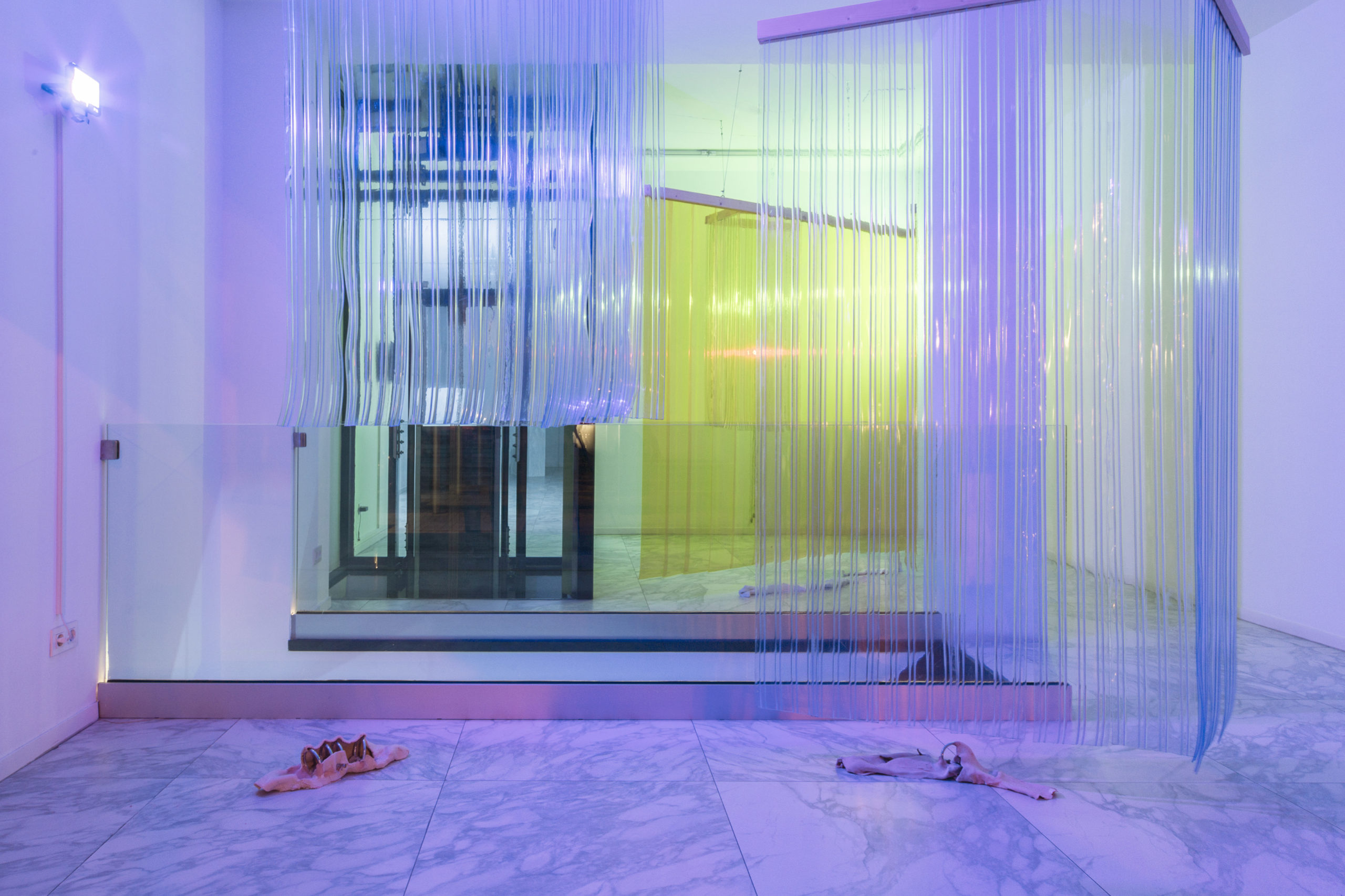 Los ugly enemies que Esther Gatón ha construido y dispuesto en Cibrián Gallery (Donostia-San Sebastián, 2020-21) se despliegan a través de una dependencia mórbida para con el espacio que ocupan y, siguiendo el imaginario del último giro antropocénico del arte con alusiones a la vida submarina, en el que bien podrían, tangencialmente, inscribirse, establecen una forma de interacción cuasi biológica respecto de la arquitectura de la galería. Bajo las coordenadas del comensalismo, del latín cum mensa, tanto las obras presentadas como el espacio ocupado, y sus particularidades, se sientan en una misma mesa compartida –la que ofrece el momento expositivo–, en la que aquellas se benefician mientras que éste no se ve perjudicado.[1]Esther Gatón ha escrito sobre la comensalidad, que no comensalismo, como infraestructura para el arte en “Lo que la forma hace hacer. Usos y comensalidad”, Materiales concretos, 23 de septiembre … Continue reading ¿Sería deseable que este parentesco tornase hacia un horizonte fundamentado en el mutualismo? De hecho, esa tensión recorre la muestra y llega a vislumbrarse en algún instante. De esta manera, nos encontramos con una iluminación diseñada para interactuar con los cortinajes de PVC dispuestos tras la vitrina o el escaparate de entrada, que intensifica y pervierte el carácter del clásico display window; así también respecto de la ubicación relativa de los elementos de conexión sucesivos, escalera y ascensor; al fondo de la sala se sitúan tres falsas peanas a modo de pequeños monolitos, que imitan al mármol, en continuidad con el acabado del suelo; en el sótano nos reciben una serie de estrechas plataformas de tramex sobre las que podemos –o no– caminar. Entre las cortinas acrílicas y el plano del suelo, ignorando las peanas vacantes pero colonizando la pared, bajo o junto a los planos metálicos elevados se salpican “las piezas”, contradictoriamente atropomorfizadas como ugly enemies bajo ese título común: pequeñas esculturas orgánicas e informes de porcelana vidriada e impresiones digitales sobre seda, entre otras. Esta esquemática dualidad interpretativa, arbitraria, entre los objetos escultóricos y sus respectivas puesta en escena, evidencia la percepción engañosa que las promueve, juguetona, la fabricación de apariencias fake, la transición entre géneros y materiales que se visibiliza en los títulos más acertados de algunas de las instalaciones, como Slimy Trampantojo, Falso o Lo Crudo y lo Cocido; la concreción física de esta última referencia al archiconocido libro de Lévi-Strauss encarna no ya la inagotable dialéctica naturaleza y cultura, o fondo y figura, sino la propia del arte y su exposición. El frágil matiz de su tramposa distinción.[2]Sobre el momento expositivo como trampa ver: Esther Gatón, “Sunburns”, A*Desk, 28 de septiembre de 2020.